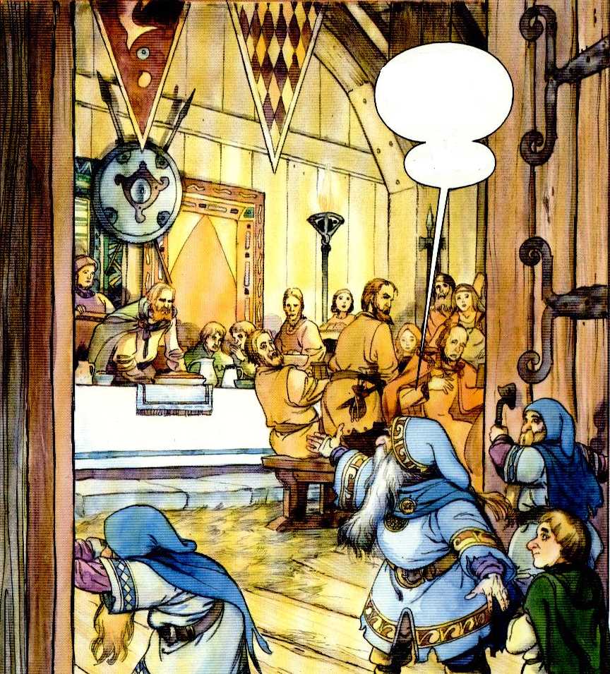 “Thorin son of Train son of Thror King under the Mountain!” said the dwarf in a loud voice, and he looked it, in spite of his torn clothes and draggled hood. The gold gleamed on his neck and waist; his eyes were dark and deep.