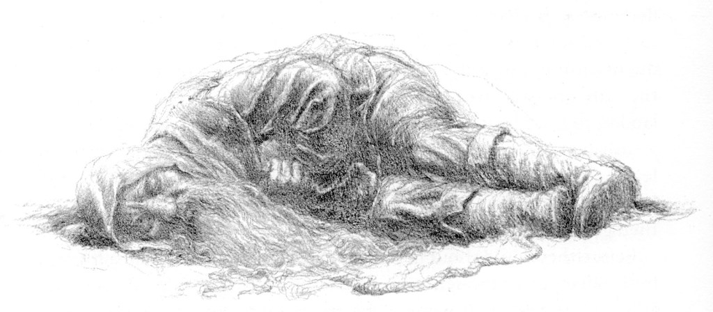 Then on his way out, Bilbo bumps into Gandalf. Peter Jackson gets this all wrong. His Gandalf tries to convince Bilbo to stay in the camp; Tolkien’s Gandalf allows Bilbo to make his decision and sends him on his way with encouragement for the hard times coming.