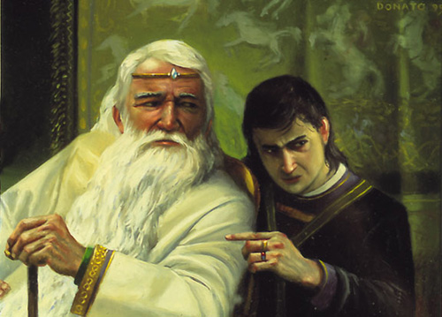 "Persuasive Words" by Donato GiancolaIf there is an exorcism, it is not an exorcism of Saruman in his tower, looking through a Palantir. It is the casting out of Wormtongue’s own lies, the breaking of the web of half-truths and untruths than has Theoden bound in despair.