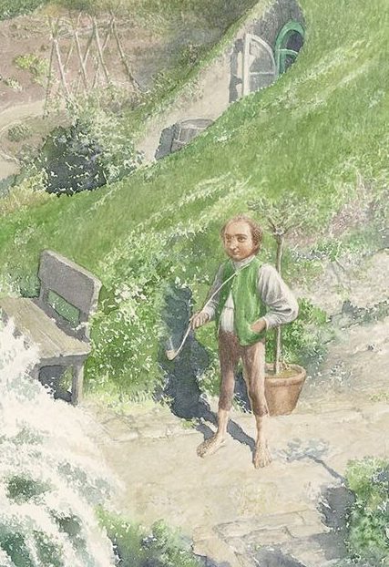 Detail, "Bilbo at Bag End" by Alan LeeAt any rate, let’s begin at the beginning: our introduction to Bilbo Baggins in chapter one of The Hobbit. By some curious chance one morning long ago in the quiet of the world, when there was less noice and more green, and the hobbits were still numerous and prosperous, and Bilbo Baggins was standing at his door after breakfast, smoking and enormous long wooden pipe that reached nearly down to his woolly toes (neatly brushed)—Gandalf came by.